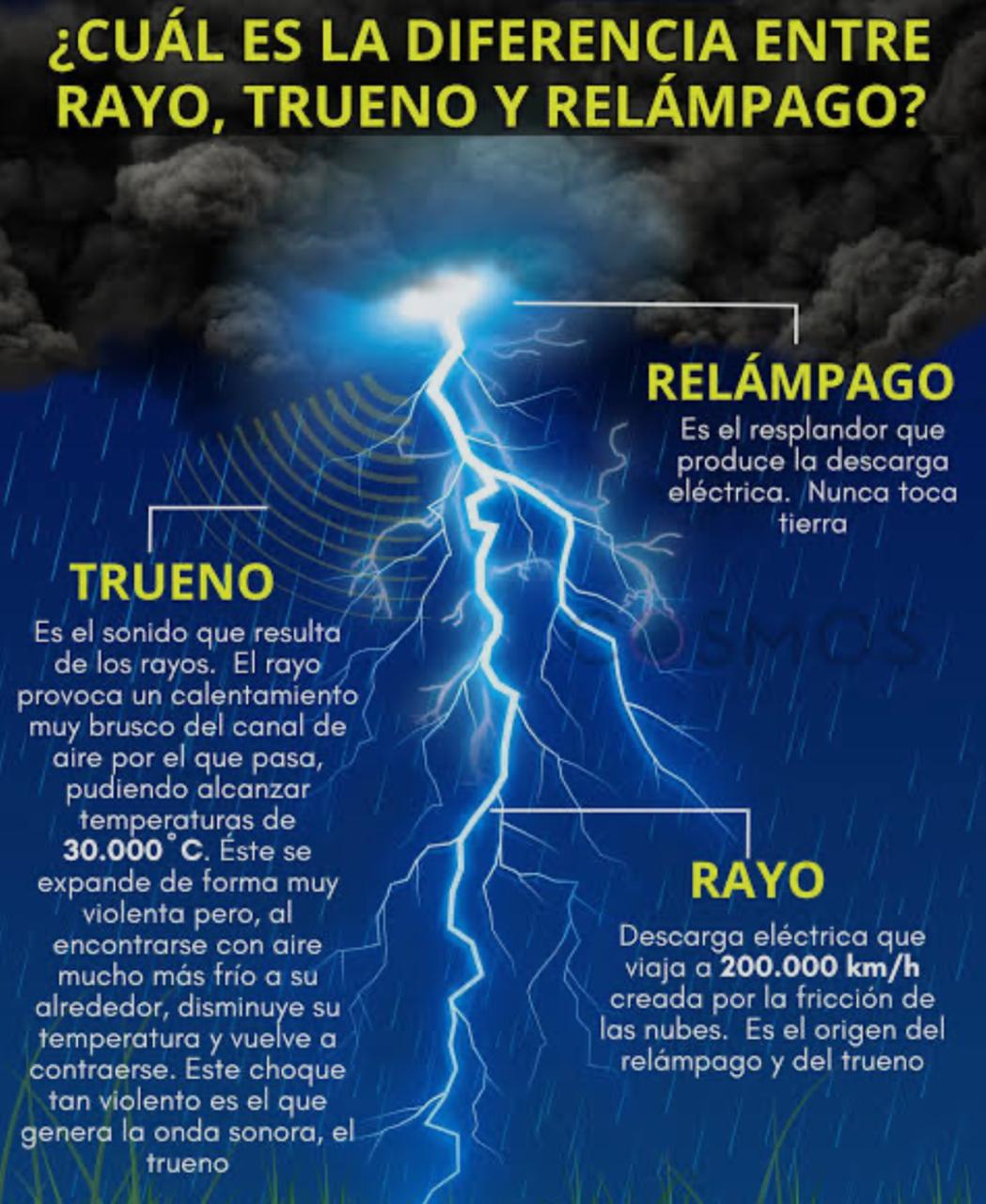 El rayo es la descarga eléctrica entre nubes, entre nube y tierra, o dentro de una nube. El relámpago es la luz que se produce por la descarga eléctrica del rayo. El trueno es el sonido que se produce por la expansión rápida del aire debido al calor del rayo.